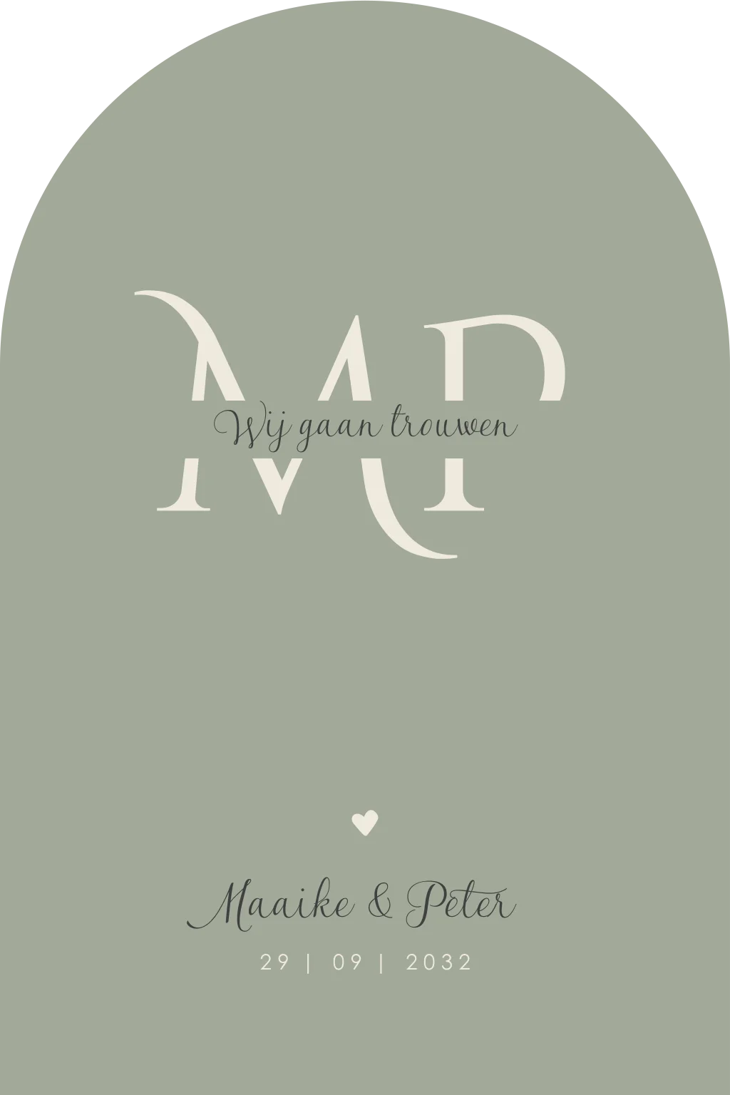 Ontwerp een klassieke trouwkaart in boogvorn. Dit is een dubbele boog trouwkaart, waardoor er genoeg ruimte is voor alle informatie over jullie trouwdag. Geef met behulp van de icoontjes uit de beeldbank het dagprogramma van jullie groene trouwkaart weer.