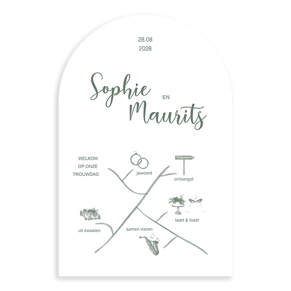 Trouwkaart in boogvorm met plattegrond en icoontjes