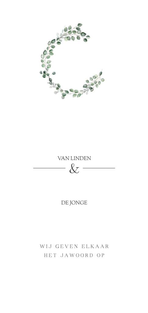 Een stijlvolle trouwkaart in langwerpige vorm met eucalyptuskransje. Op deze trouwuitnodiging wordt goudfolie gedrukt, wat zorgt voor een chique look.Totaalprijs: 0 |