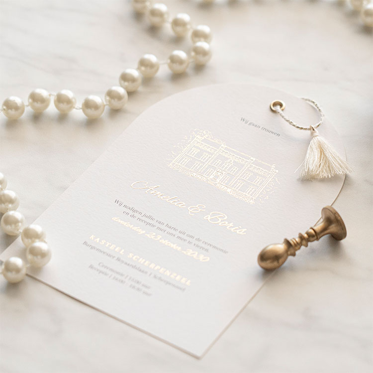 Ontwerp een klassieke trouwkaart in boogvorm met tassel. De tassel bestel je hier