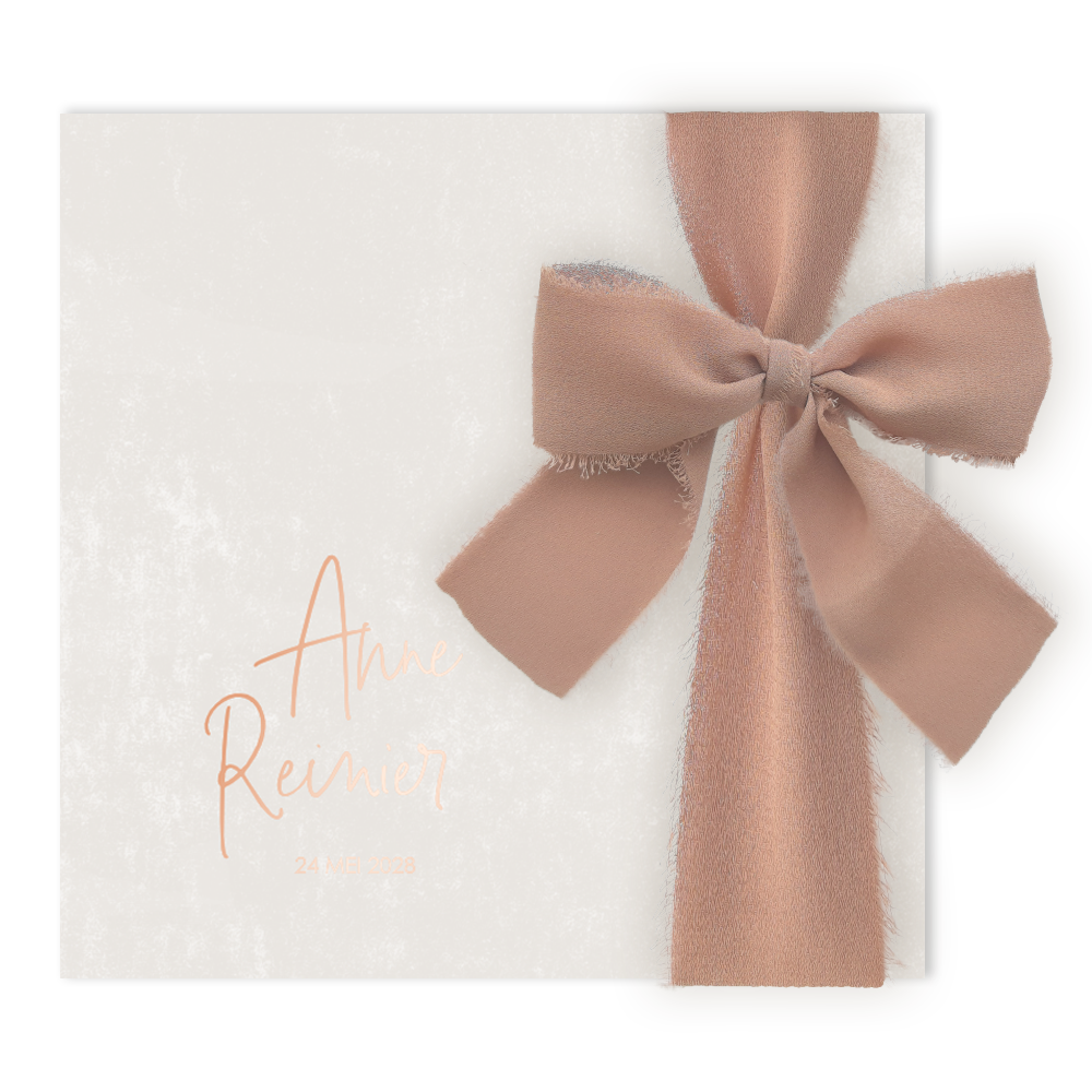 Deze klassieke trouwkaart kies je als deze past bij de stijl en sfeer van jullie bruiloft. Je kunt een lint bij de trouwkaart bestellen in de kleur die jullie mooi vinden. Op beide zijden wordt folie gedrukt. De kleur van de folie zou je naar eigen wens kunnen aanpassen.