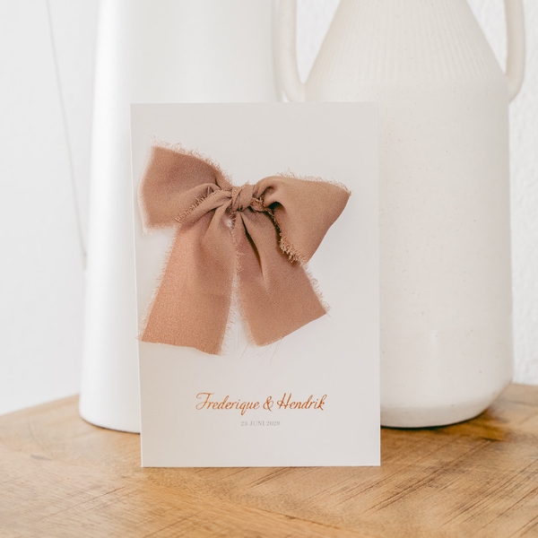 Bestel bij deze trouwkaart onze ecro lint van Chiffon Zijde. Door de snijlijnen op de voorkant kun je de lint halen en strikken. Zo heb je een prachtige strik op de voorkant en daarmee een unieke trouwkaart.