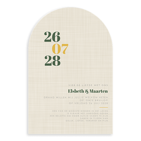 Ontwerp een moderne trouwkaart in boogvorm. De kleuren pas je eenvoudig aan naar wens in de editor.