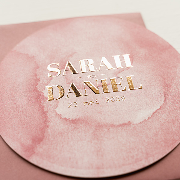 Kies voor een ronde trouwkaart in een opvallende magenta kleur. Liever een andere tint? Je kunt zelf de kleur aanpassen in de editor. Op beide zijden van deze trouwkaart wordt roséfolie gedrukt. Ook deze kleur kun je aanpassen.