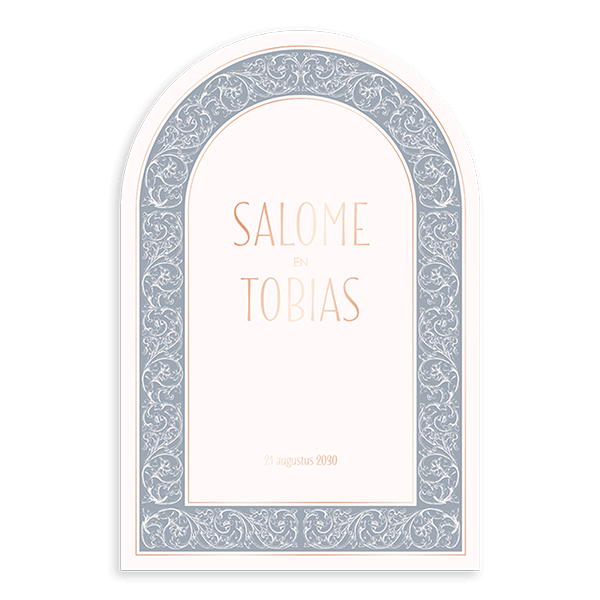 Ontwerp een trouwkaart in boogvorm met vintage element. Pas deze vintage trouwkaart aan naar wens in de editor en stuur naar familie en vrienden. De teksten worden in roséfolie gedrukt, wat zorgt voor een glimmend laagje op de kaart.