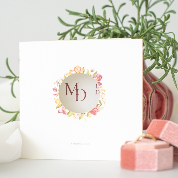 Ontwerp een unieke trouwkaart met een rond stansgat in de voorkant. Door dit uitgesneden rondje kijk je naar de binnenkant van de kaart, waar je jullie logo invoegt. In de editor voeg je eenvoudig alle informatie over jullie trouwdag toe aan deze romantische, vintage trouwkaart met bloemen.