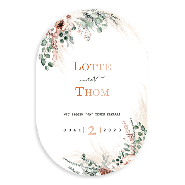 Maak een bruiloft uitnodiging met bloemen en hoogglans in een ovaal. Je kunt een andere kleur hoogglans kiezen of de folie vervangen voor een mooie kleur. Alle teksten kun je aanpassen zodat deze past bij jullie bruiloft.