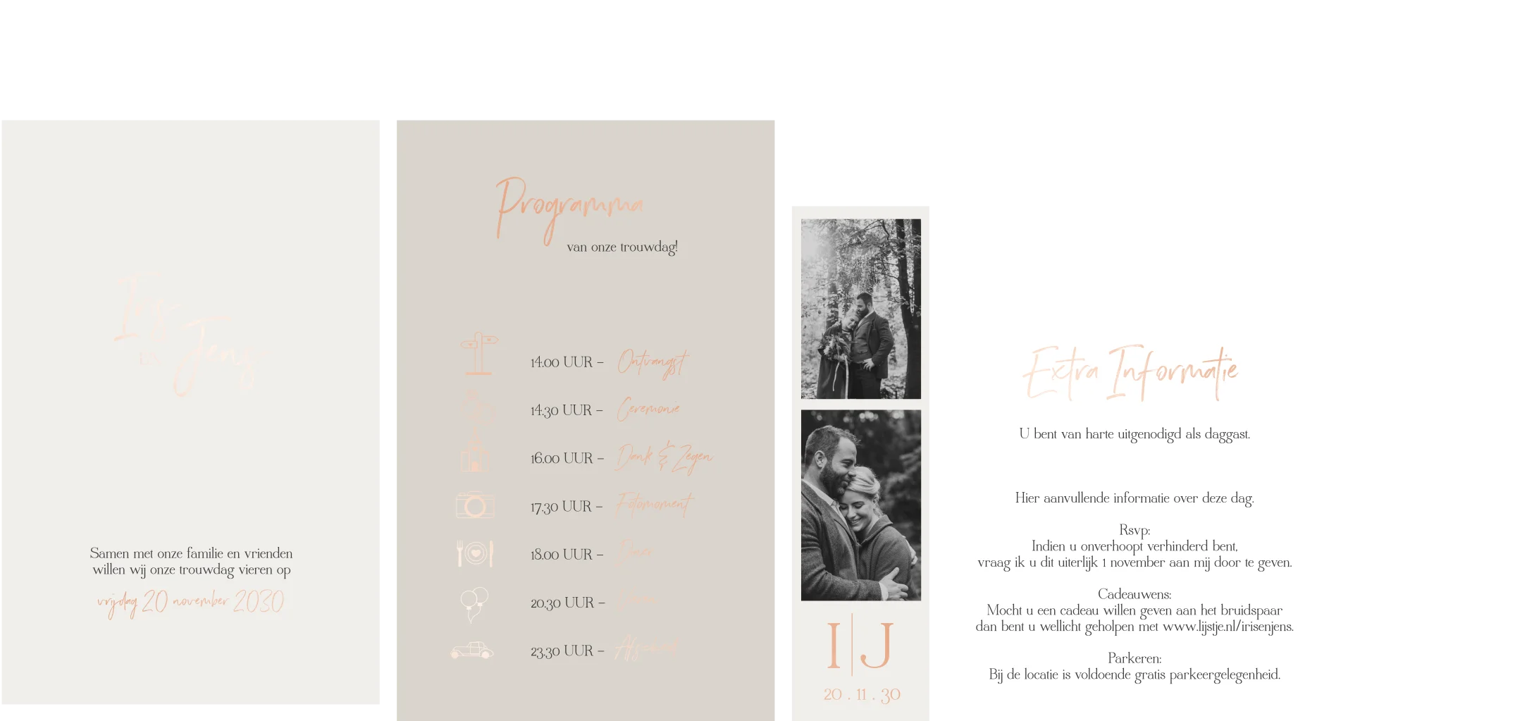 Maak een stijlvolle pocketfold trouwkaart met roséfolie. Op het labeltje upload je eenvoudig een je persoonlijke foto's. De linker kaart plak je in de pocketfold met een lijmstick (geen vloeibare lijm). De andere 2 kaarten schuif je in de pocket van het mapje.
