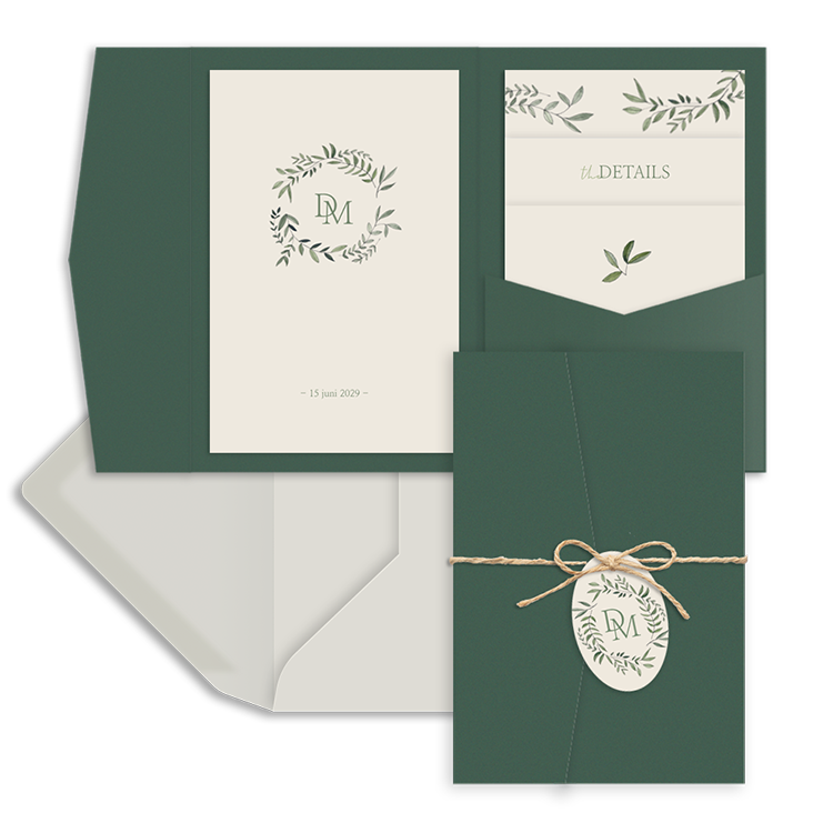 Ontwerp een pocketfold trouwkaart voor jullie trouwdag. Dit is een botanische trouwkaart met illustraties van takjes en blaadjes.