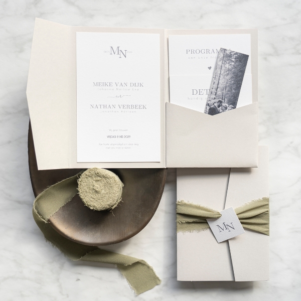 Kies voor een zand pocketfold met deze trouwkaartjes erin.