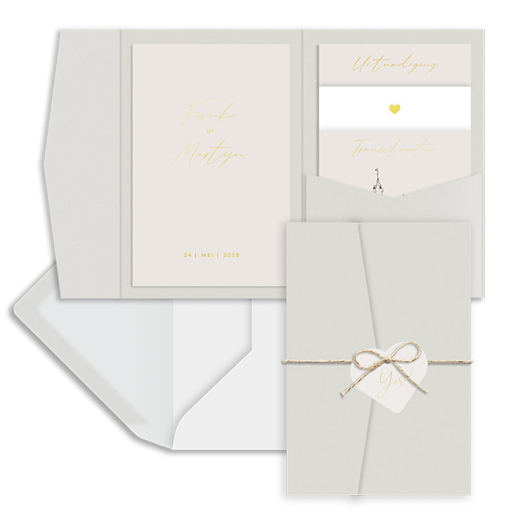 Ontwerp een kaartenset voor een pocketfold trouwkaart. Dit is een klassieke trouwkaart teksten in goudfolie. De linkerkaart plak je zelf vast in de pocketfold. Wij adviseren een lijmstift en geen vloeibare lijm te gebruiken. De overige kaartjes schuif je in het mapje. Op de achterkant van het middelste kaartje upload je in de editor eenvoudig een persoonlijke foto.