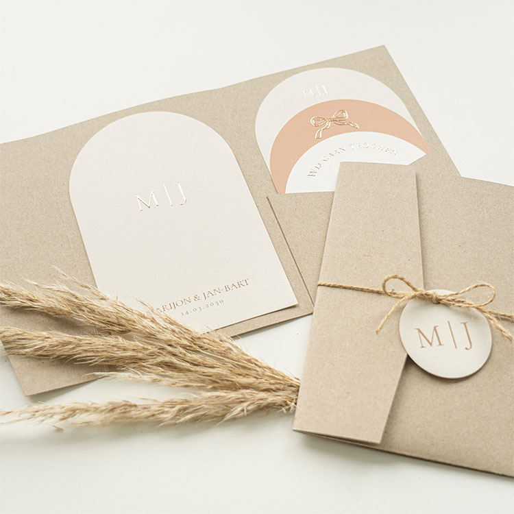Ontwerp een romantische pocketfold trouwkaart met boogkaartjes in pasteltinten. De linker kaart met jullie logo in roséfolie plak je (met een lijmstift!) aan de linkerkant van het mapje. De overige kaartjes schuif je rechts in het mapje. Op deze kaartjes voeg je informatie toe over jullie trouwdag, zoals het dagprogramma en de dresscode. Op de achterkant van het grootste kaartje upload je eenvoudig een foto via de editor. Het ronde labeltje gebruik je om het mapje mee dicht te maken.
