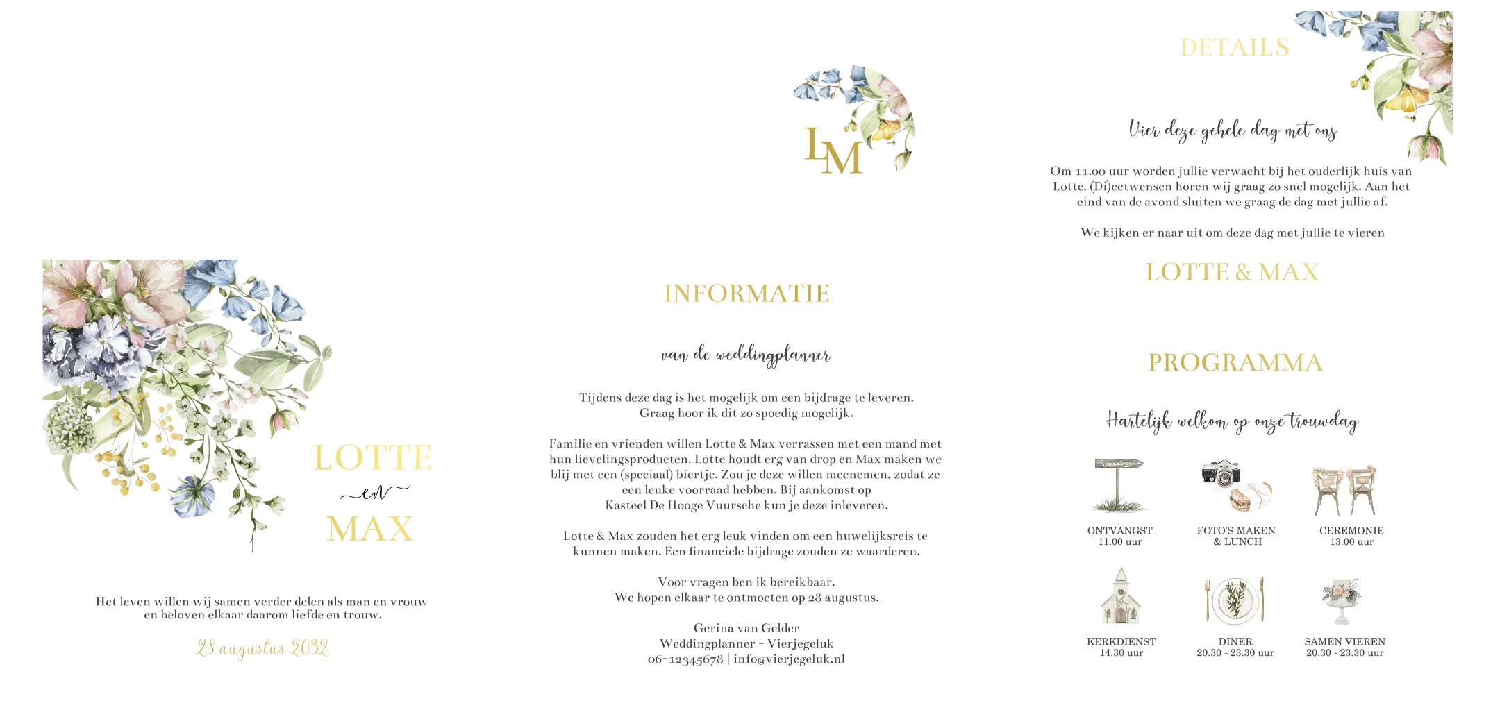 Ontwerp een stijlvolle trouwkaart met bloemen voor jullie trouwdag. Dit is een pocketfold trouwkaart met meerdere kaartjes die je schuift in een kraft pocketfoldmapje. De meest linkse kaart plak je in het mapje (met een lijmstift!). De overige kaartjes schuif je aan de rechterkant in het mapje. Geef met behulp van de icoontjes uit de beeldbank het programma weer op een van de kaartjes. Op deze trouwkaart klassiek wordt goudfolie gedrukt.