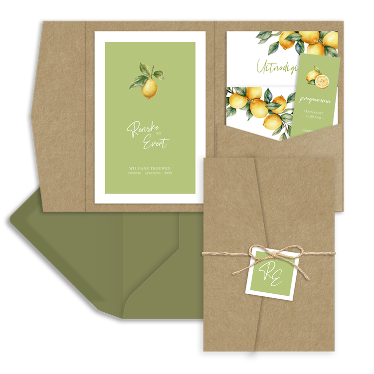 Deze pocketfold trouwkaart met citroentjes maakt deel uit van een trouwkaartenset.