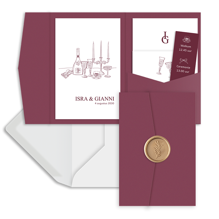 Bestel een trend pocketfold trouwkaart met getekende icoontjes in bessenrode tinten. Dit is een trouwkaart met meerdere kaartjes die je schuift in een pocketfold mapje. De linkerkaart plak je rechts in het mapje. Wij adviseren een lijmstift te gebruiken, zo voorkom je vlekken.