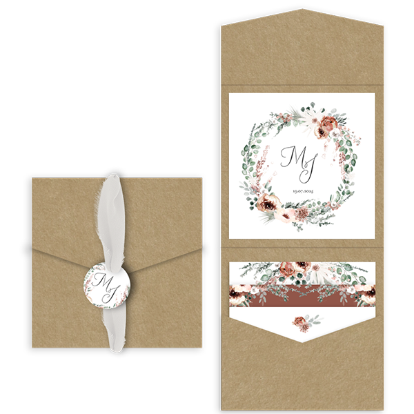 Deze bohemian pocketfold trouwkaart maakt deel uit van de Bohemian Chic trouwhuisstijl.