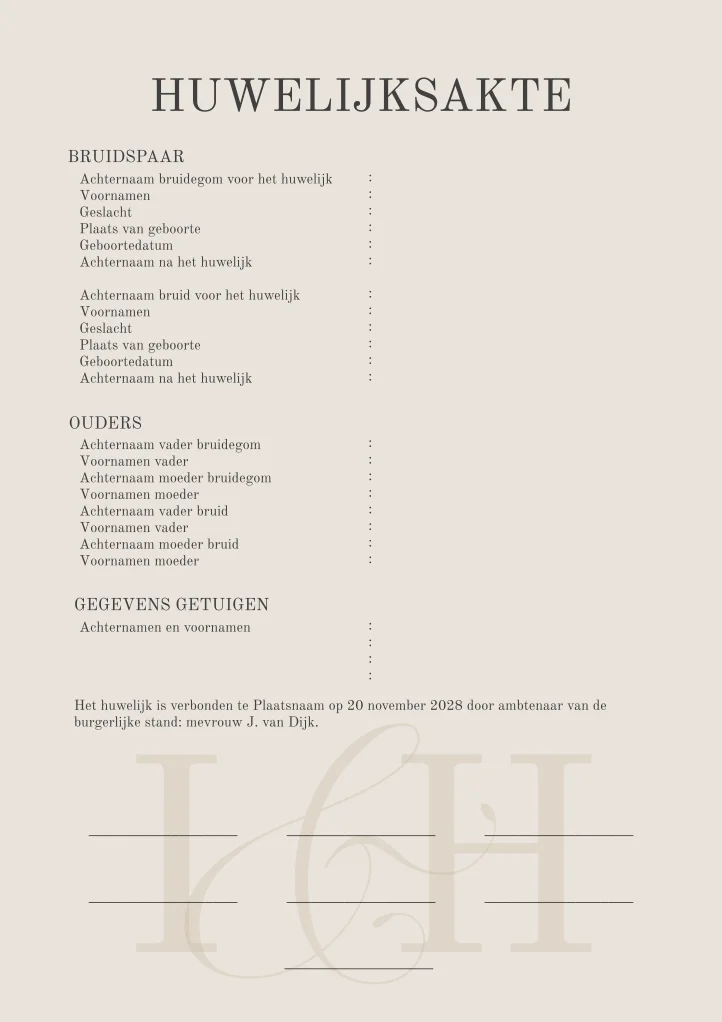 Maak een klassieke trouwakte in beige kleur met jullie logo op de achtergrond. In de kaartopmaker kun je deze trouwakte helemaal zelf aanpassen.