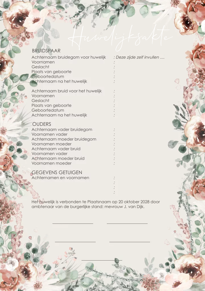 Bestel een romantische trouwakte met bloemen en goudfolie. Op deze akte is genoeg ruimte voor het invullen van jullie namen.