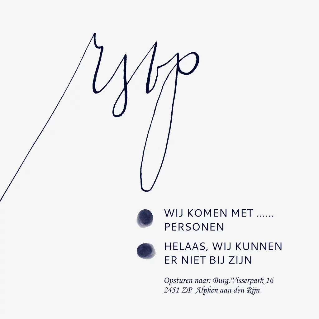Dit kaartje matcht perfect bij de trouwkaart. Willen jullie graag antwoord op vragen die nodig zijn voor reserveringen op jullie trouwdag? Bestel dan dit unieke RSVP kaartje met watercolor strepen in de kleur blauw.