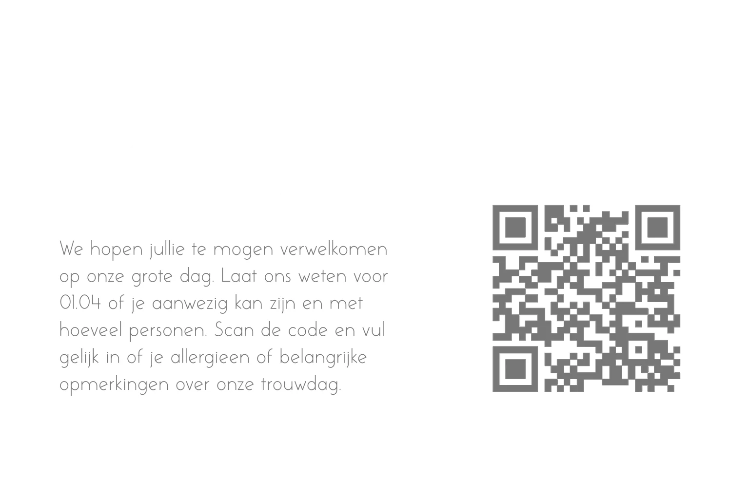 Bestel een handig rsvp-kaartje bruiloft bij de trouwkaart. Zo weet je zeker of iedereen aanwezig kan zijn op jullie trouwdag. Dit is een liggend rsvp-kaartje met goudfolie.