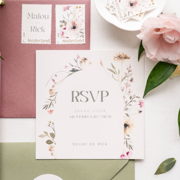 Dit romantische RSVP kaartje maakt deel uit van de trouwkaarten set Malou.