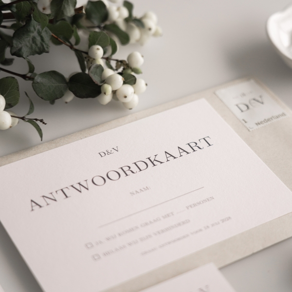 Dit stijlvolle RSVP kaartje maakt deel uit van een trouwkaartenset.