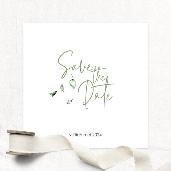 Een mooie Save the Date kaart met kleine groene blaadjes. Begin de voorbereidingen voor jullie trouwdag met het versturen van deze Save the Date kaartjes. In de kaartopmaker kun je aanpassingen doen. Daarna bestel je een proefdruk.
