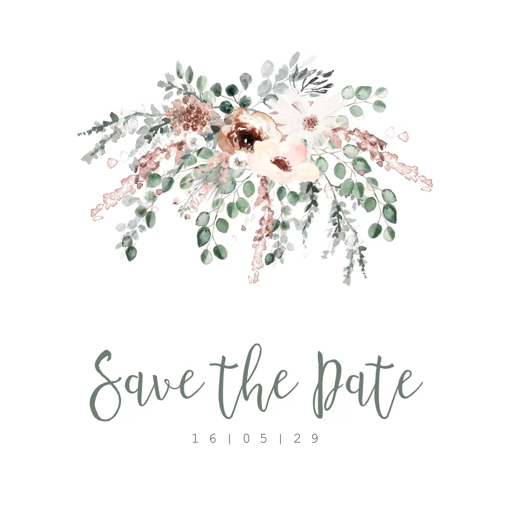Een Save the Date kaart met halve bohemian krans met pioenrozen voor een trendy Save the Date kaart. Pas de tekst aan en bestel een proefdruk voor 1 euro.