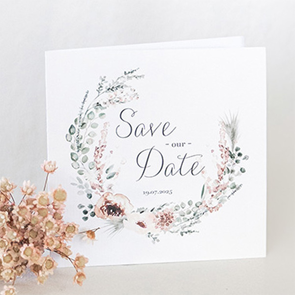 Bohemian Save tthe Date kaart met prachtige bloemen. Aan de binnezijde kun je een foto plaatsen, maar je kunt de foto ook verwijderen. Zo maak je altijd een originele Save the Date kaart.