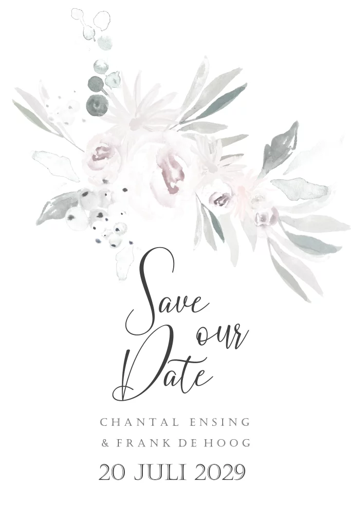 Start de voorbereidingen voor jullie bruiloft met het versturen van deze Save the Date kaart. Deze kaart past bij jullie als jullie een romantische bruiloft met pastel tinten willen organiseren. Er zijn ook bijpassende kaarten met dit ontwerp. Ga naar de kaartopmaker om deze kaart te bewerken en een proefdruk te bestellen.