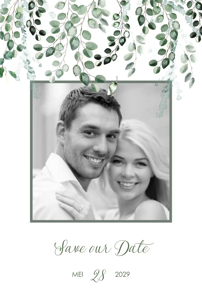Plaats jullie eigen foto op deze Save the Date kaart. Een ander formaat is ook mogelijk - neem contact met ons op! Is dit de sfeer die jullie willen voor de bruiloft? Begin dan met het versturen van deze unieke Save the Date.