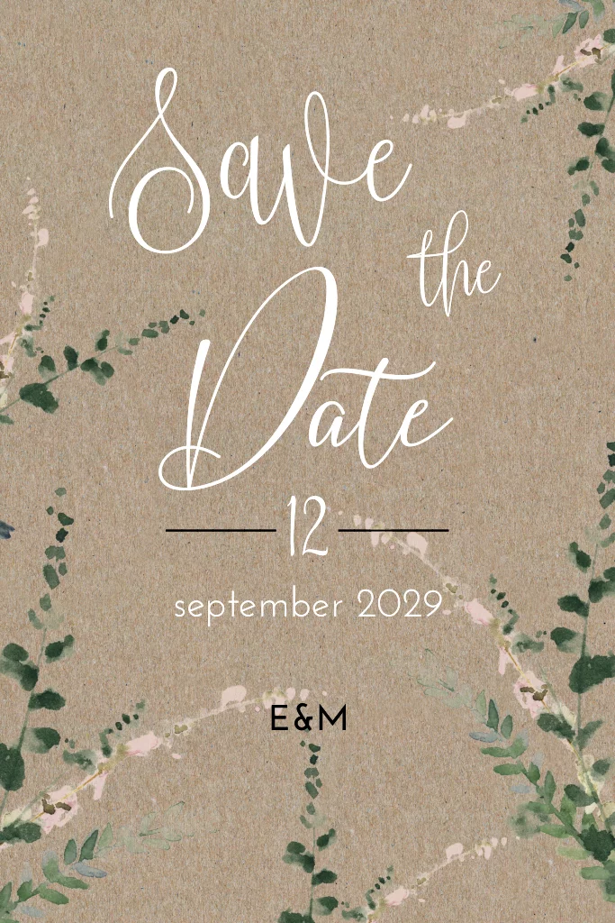 De Save the Date kaart met takjes wordt op kraftpapier gedrukt. Je kunt in de kaartopmaker de teksten aanpassen.