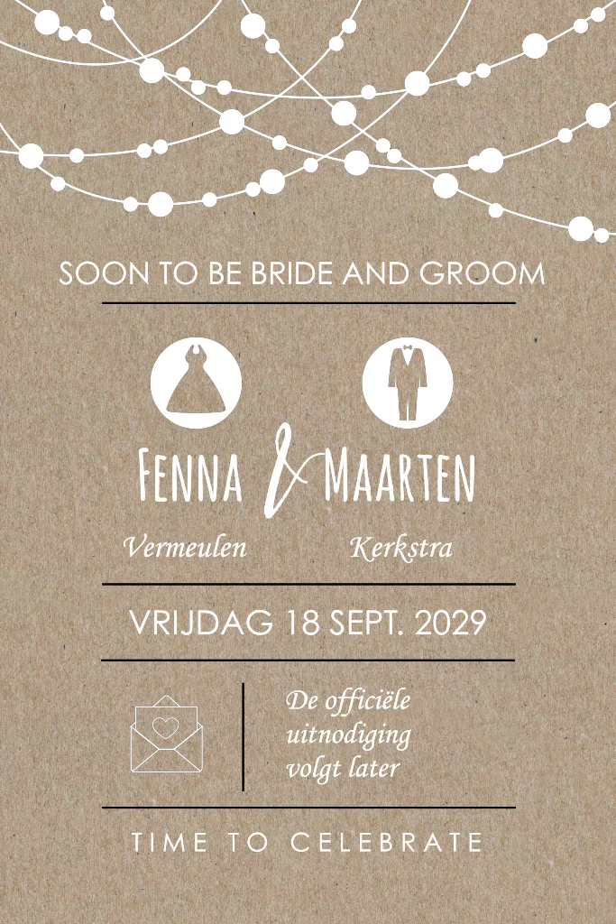 Een kraft Save the Date kaart met lampjes voor een festival sfeertje.| Totaalprijs: 0 |