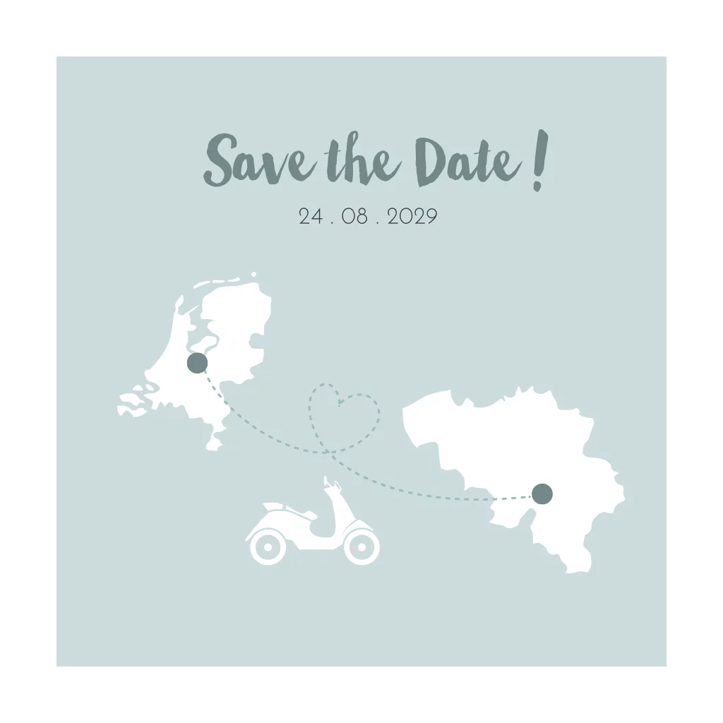 Trouwen in het buitenland - ontwerp een Save the Date kaart om familie en vrienden uit te nodigen. De afbeelding van België kan vervangen worden door elk ander land.