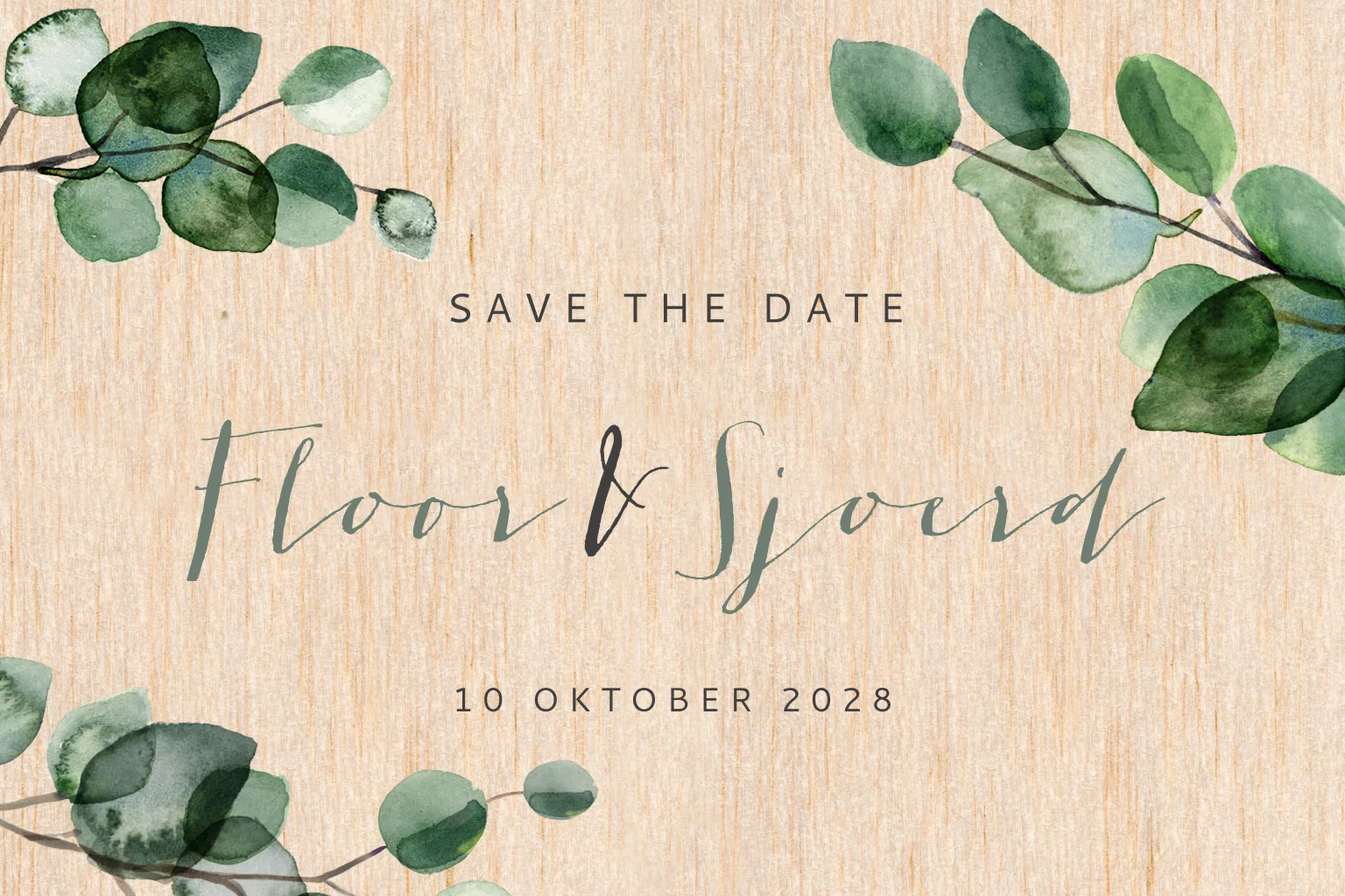 Maak een houten Save the Date kaart met botanische blaadjes. Je kunt dit ontwerp in de kaartopmaker aanpassen. Tijdens het bestellen van de houten Save the Dates kun je kiezen uit meerdere formaten. We hebben ook een bijpassende trouwkaart op de site staan.