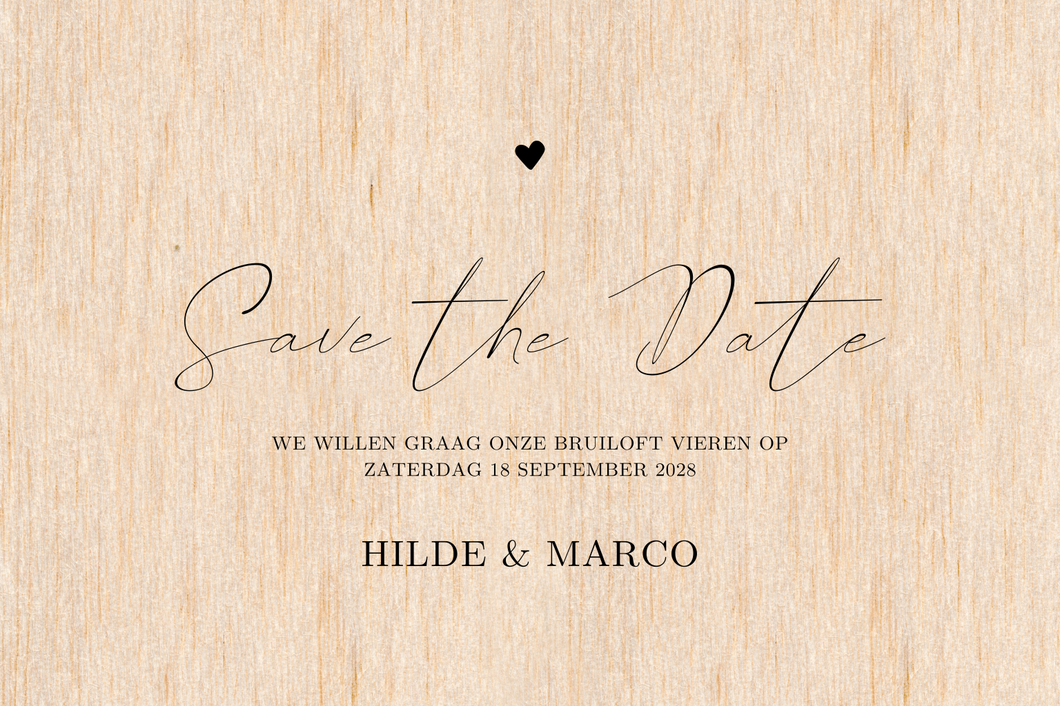 - Houten Save the Date kaartjes zijn een natuurproduct dus elke kaart is anders.