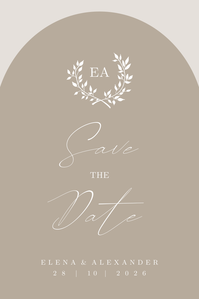 Maak een stijlvolle Save the Date kaart met kransje en boog. Een mooie combinatie van klassiek & modern. Kies 2 kleuren die passen bij de stijl en sfeer van jullie bruiloft. Een Save the Date kaart in de vorm van een boog? Knip dat deze Save the Date kaart op maat met een schaar. Zo maak je een echt unieke Save the Date kaart.