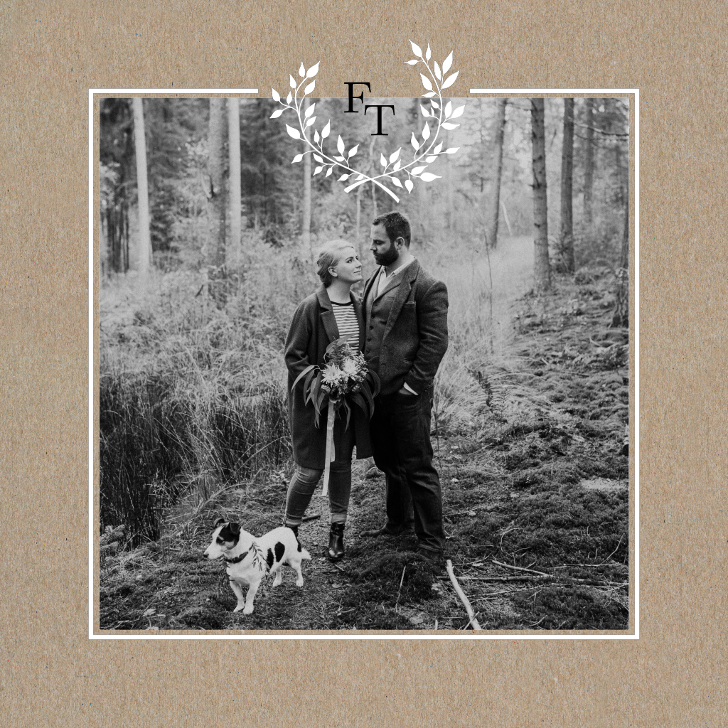 Een Save the Date kaart die op kraft papier gedrukt gedrukt wordt. Je kunt je eigen foto uploaden en eenvoudig bijsnijden. In het kransje maak je jullie eigen logo. Dit logo kun je op al je drukwerk voor de bruiloft laten terugkomen.
