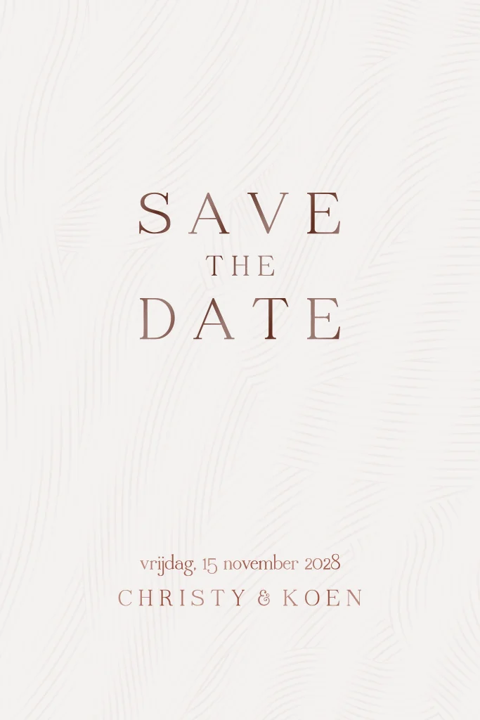 Maak een originele Save the Date kaart met patroon op de achtergrond. Dit patroon wordt gedrukt in hoogglans, waardoor het voelbaar is. Deze Save the Date past bij een trouwkaart in dezelfde stijl.