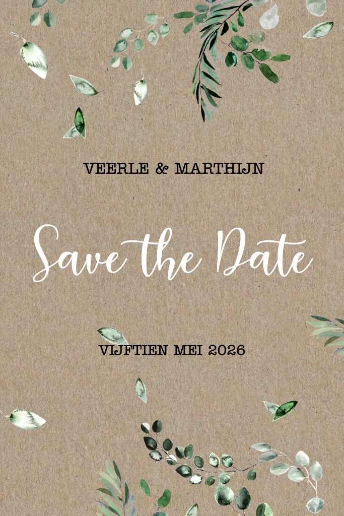 Deze kraft Save the Date kaart met blaadjes maakt deel uit van een trouwkaartenset.