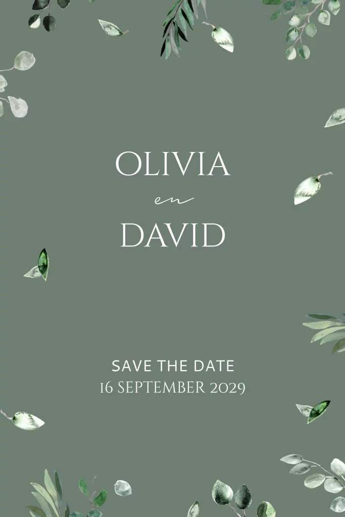 Deze botanische Save the Date kaart maakt deel uit van de trouwkaarten set Olivia.