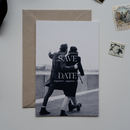 Ontwerp een moderne Save the Date bruiloft met een persoonlijke foto. De foto upload je gemakkelijk in de editor. Zo maak je altijd een persoonlijk Save the Date kaartje.