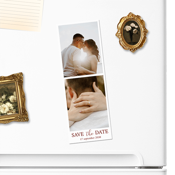 Ontwerp een save the date fotostrook bij de magneet Save the Date. Je upload zelf eenvoudig jullie mooiste foto's in de editor. Je kan deze fotostrook schuiven in de bijpassende Save the Date. Of bestel hem los als magneet Save the Date kaart.