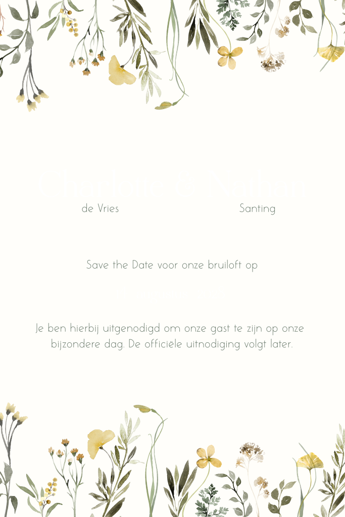 Deel de trouwdatum met de gasten door deze Save the Date kaart te sturen. Dit is een romantische Save the Date met gele bloemen. Jullie namen worden in goudfolie gedrukt, dit zorgt voor een originele look. HOE WERKT HET?