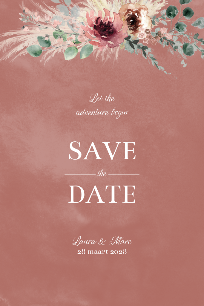 Een Save the Date kaart met bloemen ontwerp je eenvoudig met dit voorbeeld. Trend zijn de roesttinten maar ook het pampasgras. Je kunt ook folie aan deze Save the Date toevoegen.