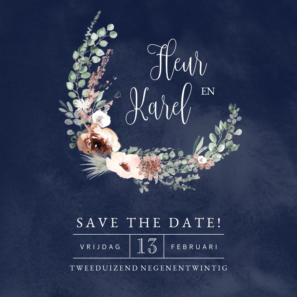 Een donkerblauwe Save the Date kaart met een bloemenkrans. Maak met deze mooie kaart jullie trouwdatum bekend.