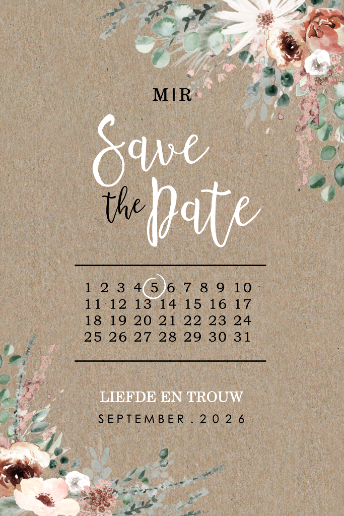 Save the Date kaart op kraft met bloemen en kalender