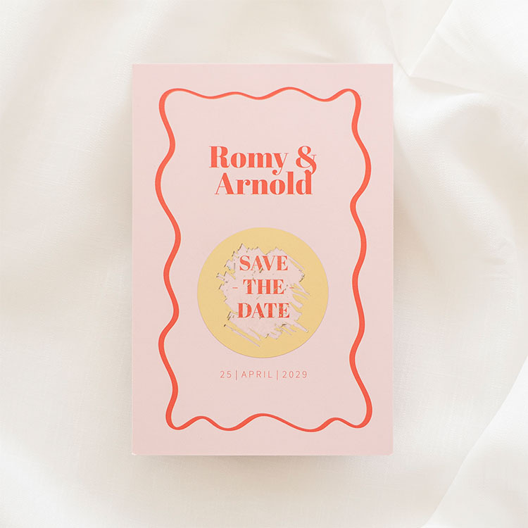 Ga voor een extra verrassingseffect en bestel deze moderne Save the Date in vrolijke kleuren met krassticker.