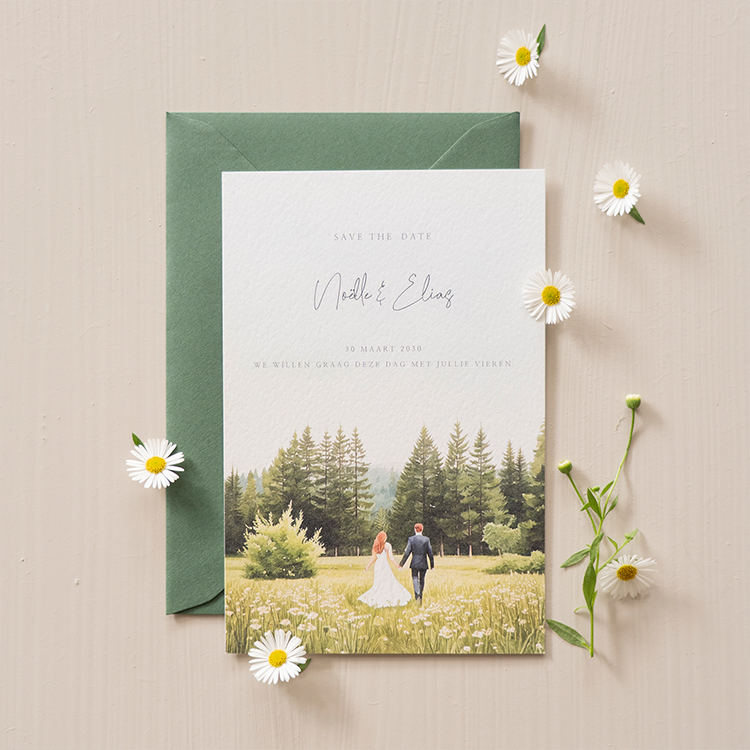 Ontwerp een romantische Save the Date zodat gasten alvast jullie trouwdatum reserveren in hun agenda. Dit is een Save the Date met tekening. Voeg in de editor jullie namen en persoonlijke informatie toe.