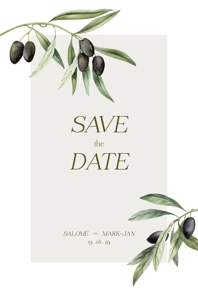 Deze Save the Date met kader en olijftakje maakt deel uit van een trouwkaartenset.